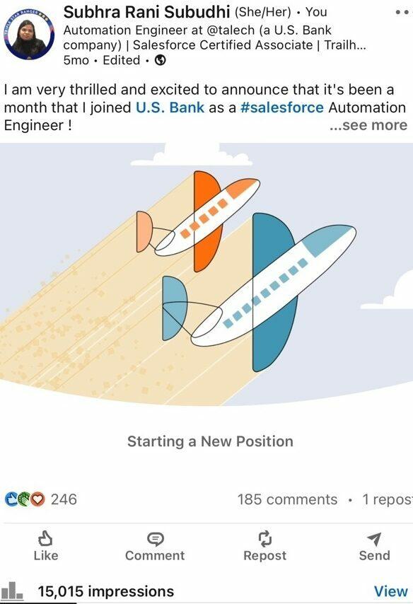Subhra Rani Subudhi relaunched as an Automation Engineer at @talech (a U.S. Bank company). Subhra, a Salesforce enthusiast with an engineering background, took an extended break after the birth of her first child. During the 12 year career break when she was also moving countries, Subhra continued to be an active learner, completing an initial Salesforce certificate program and then moving on to complete a variety of others. Subhra's wisdom, patience and optimism stands out in her #irelaunched story.