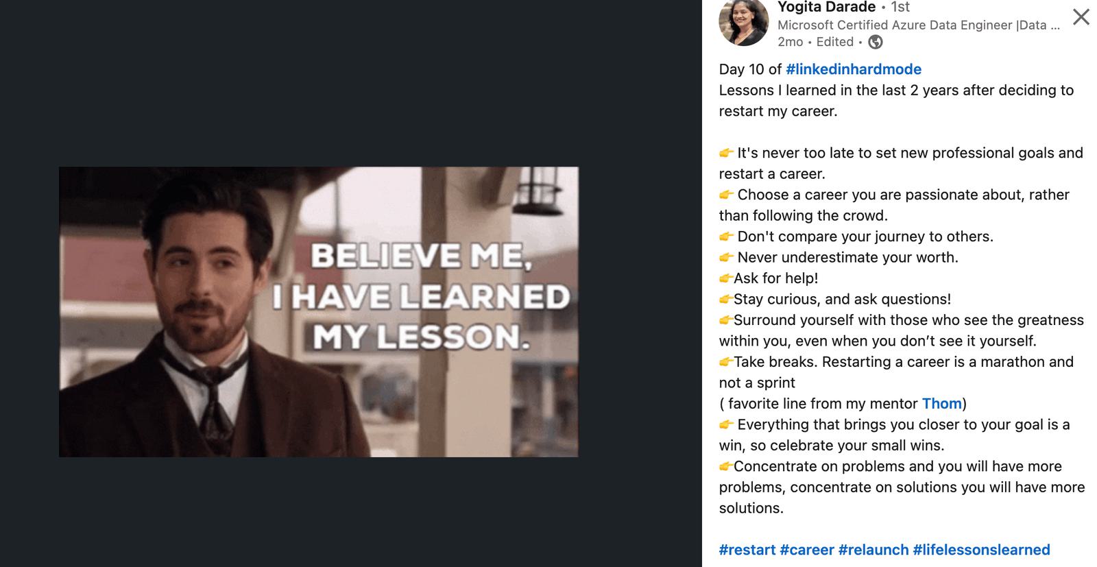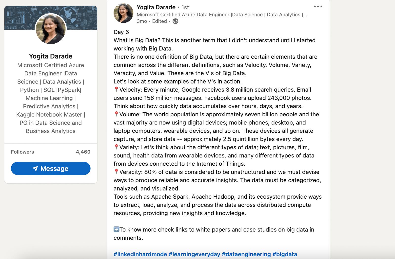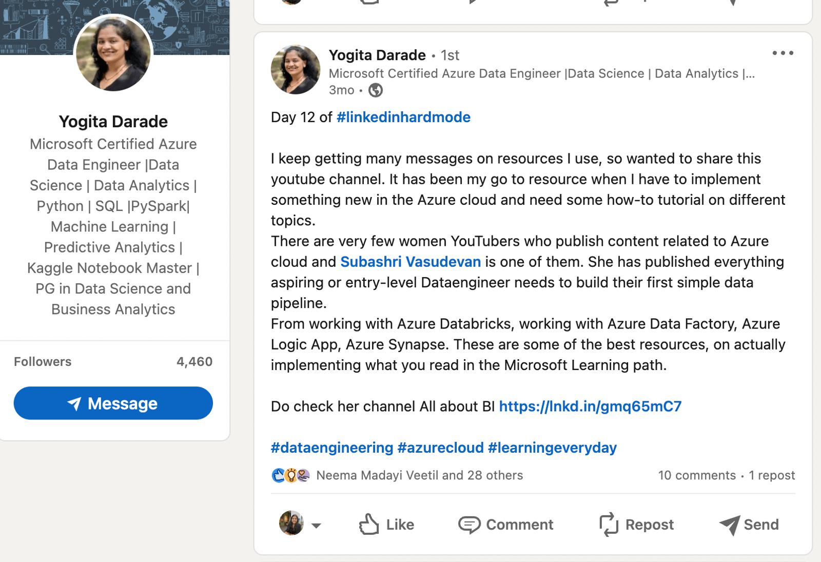 I participated in #LinkedInhardmode for all the reasons above and to get back into a habit of constantly posting, building relationships with like-minded people, adding some value to the data community, helping people who are restarting or transitioning careers, and last but not least there are not many women data engineers who are posting and I would like to encourage them to do so.