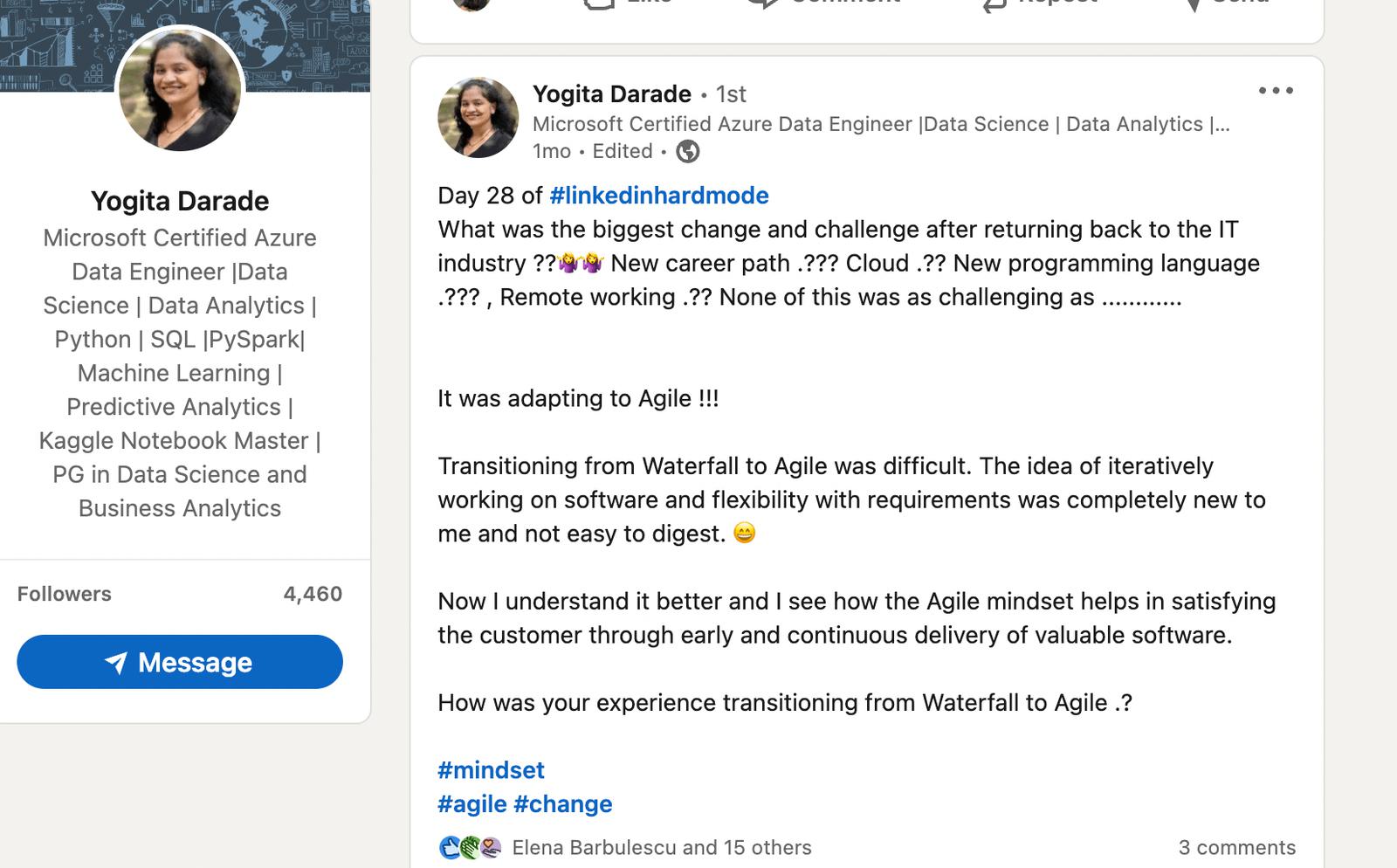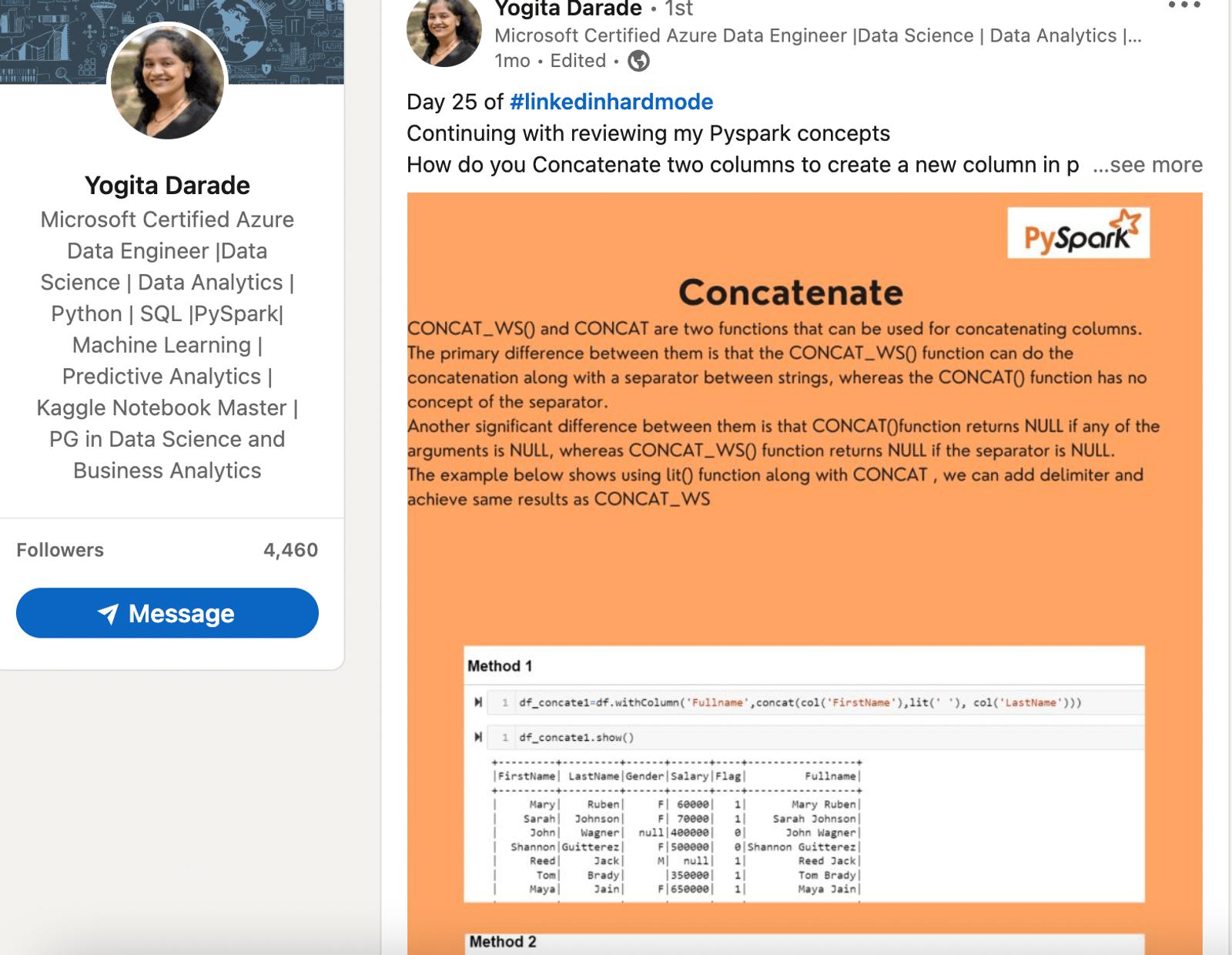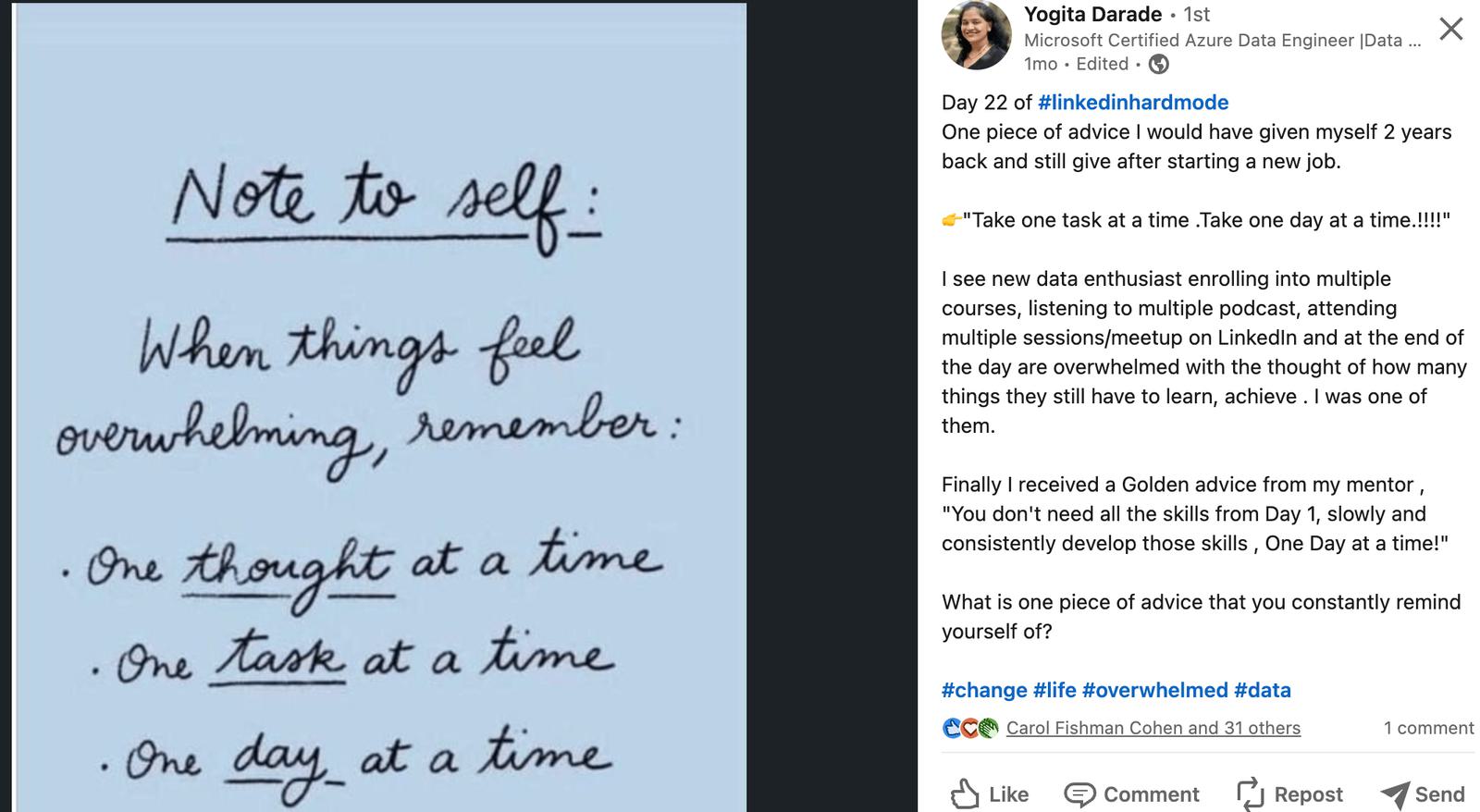 I participated in #LinkedInhardmode for all the reasons above and to get back into a habit of constantly posting, building relationships with like-minded people, adding some value to the data community, helping people who are restarting or transitioning careers, and last but not least there are not many women data engineers who are posting and I would like to encourage them to do so.